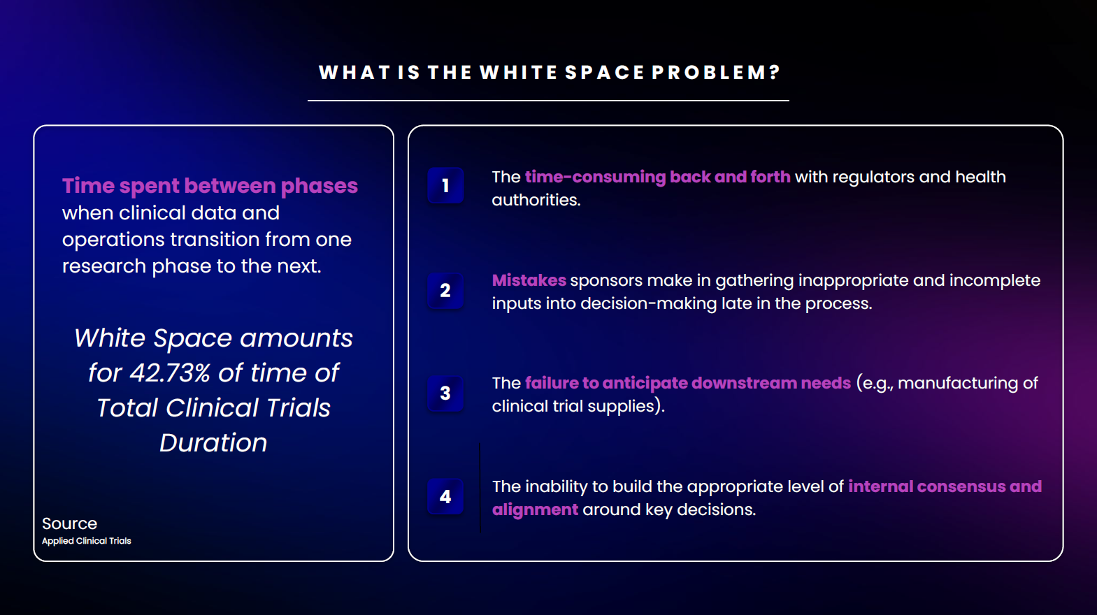 This internal white space slows down reporting, increases operational costs, and contributes to frustration among clinical teams. By streamlining processes and reducing administrative burdens, teams can focus on more strategic and scientific tasks.